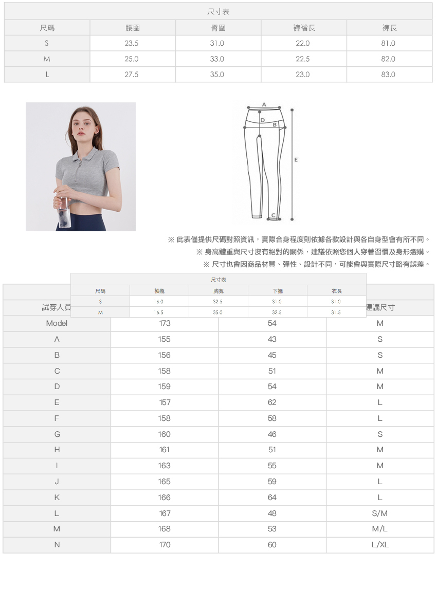 ※ 尺寸表及試穿報告僅提供尺碼對照資訊,實際合身程度則依據各款設計與各自身型會有所不同。
