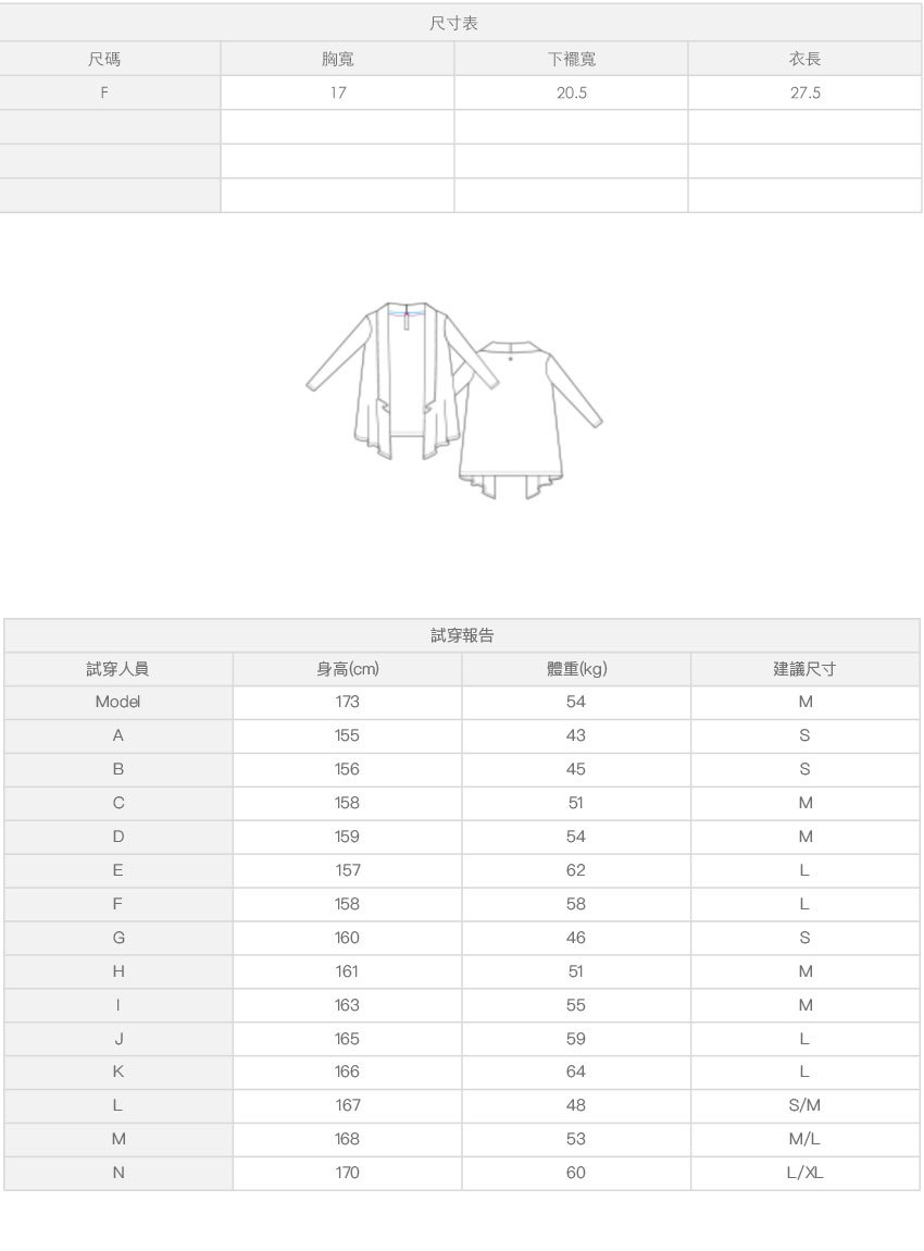 ※ 尺寸表及試穿報告僅提供尺碼對照資訊,實際合身程度則依據各款設計與各自身型會有所不同。