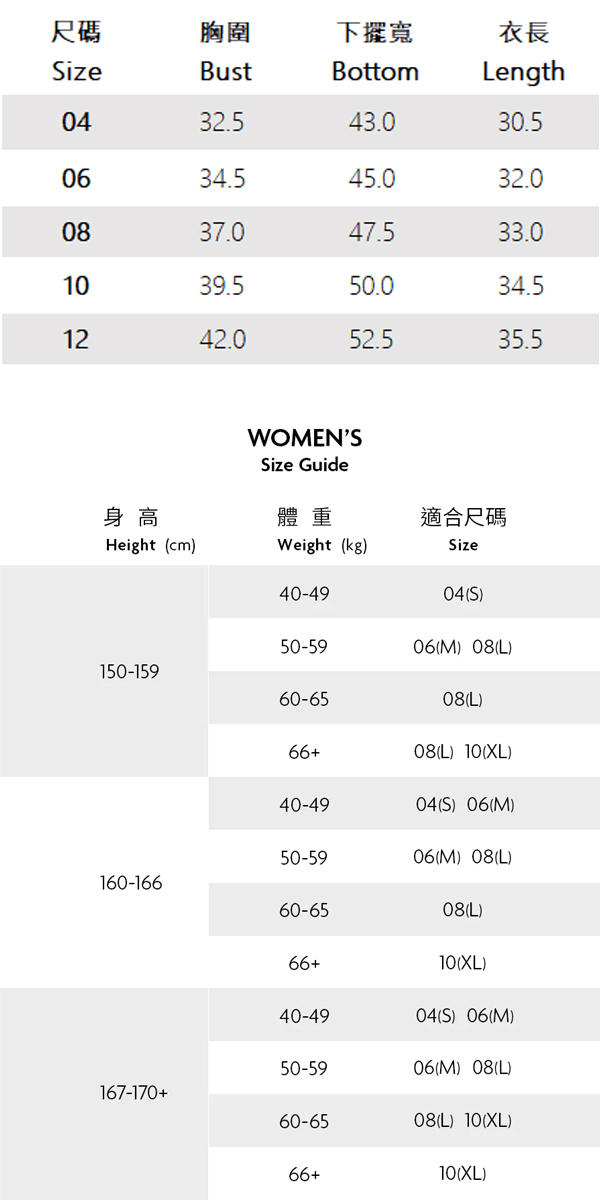※ 尺寸表及試穿報告僅提供尺碼對照資訊,實際合身程度則依據各款設計與各自身型會有所不同。