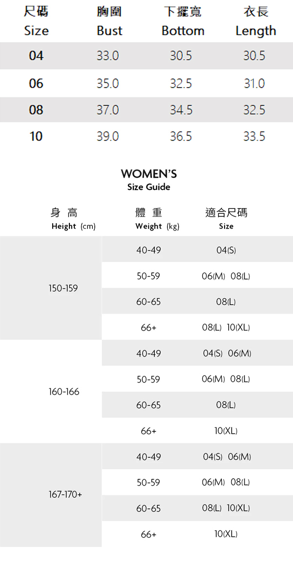 ※ 尺寸表及試穿報告僅提供尺碼對照資訊,實際合身程度則依據各款設計與各自身型會有所不同。