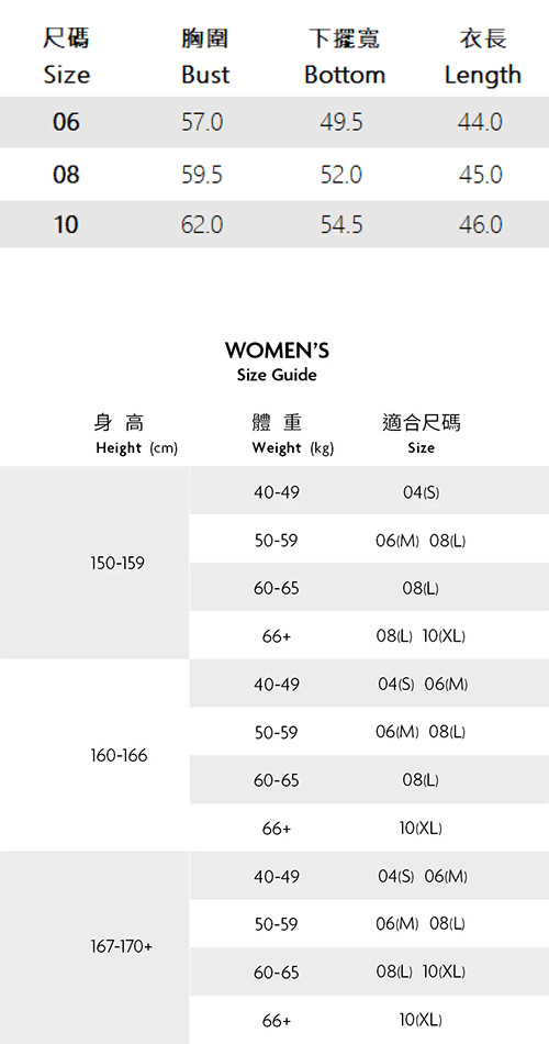 1. 尺寸表及試穿報告僅提供尺碼對照資訊,實際合身程度則依據各款設計與各自身型會有所不同。