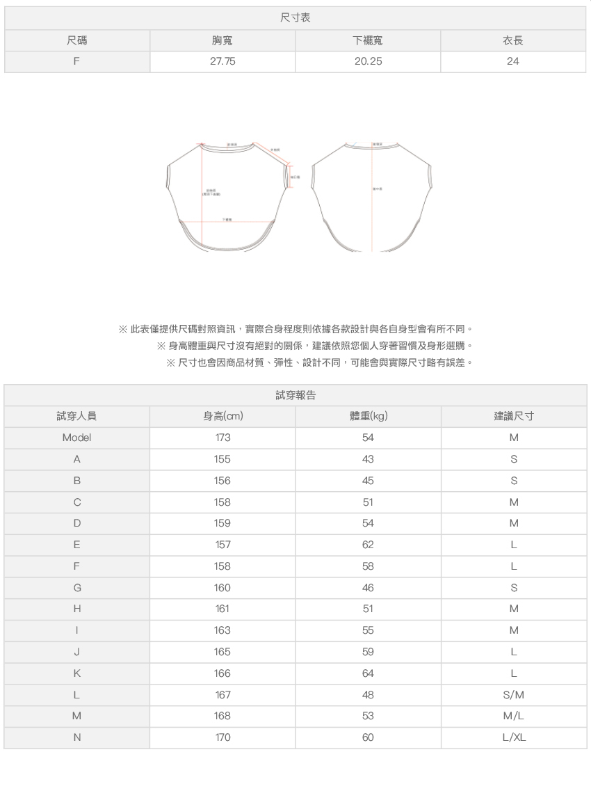 ※ 尺寸表及試穿報告僅提供尺碼對照資訊,實際合身程度則依據各款設計與各自身型會有所不同。