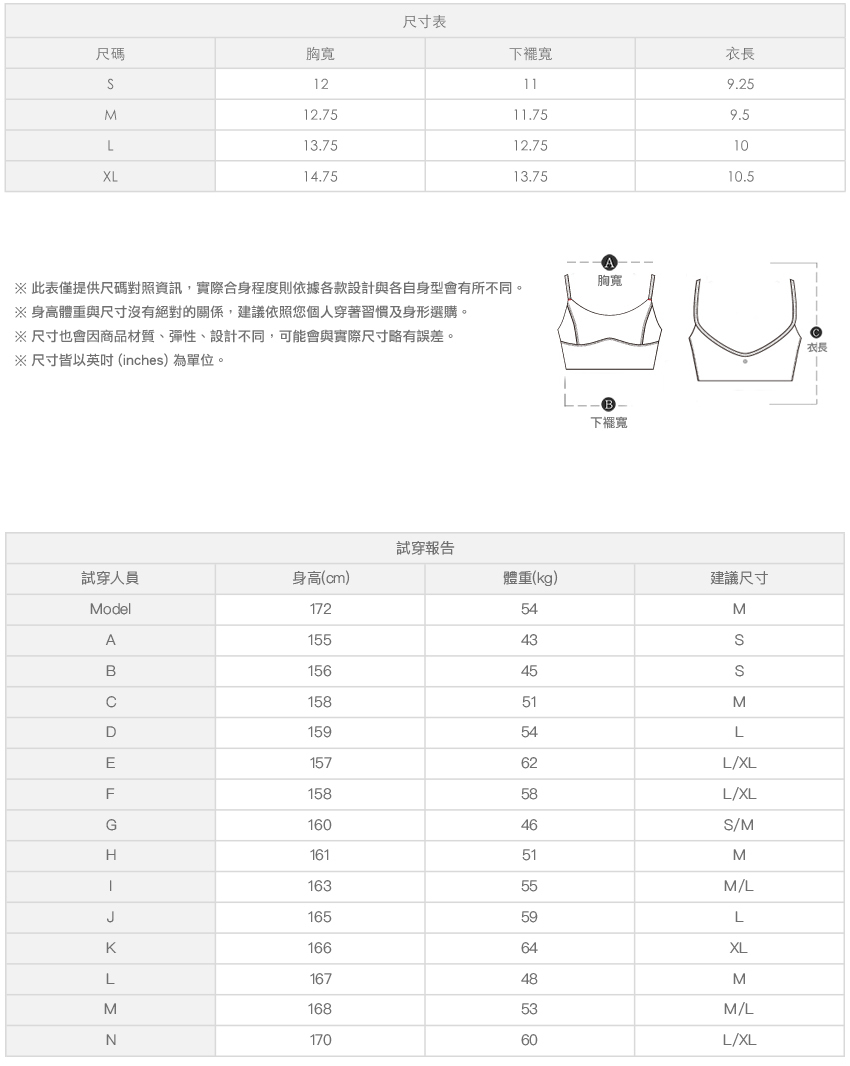 ※ 尺寸表及試穿報告僅提供尺碼對照資訊,實際合身程度則依據各款設計與各自身型會有所不同。