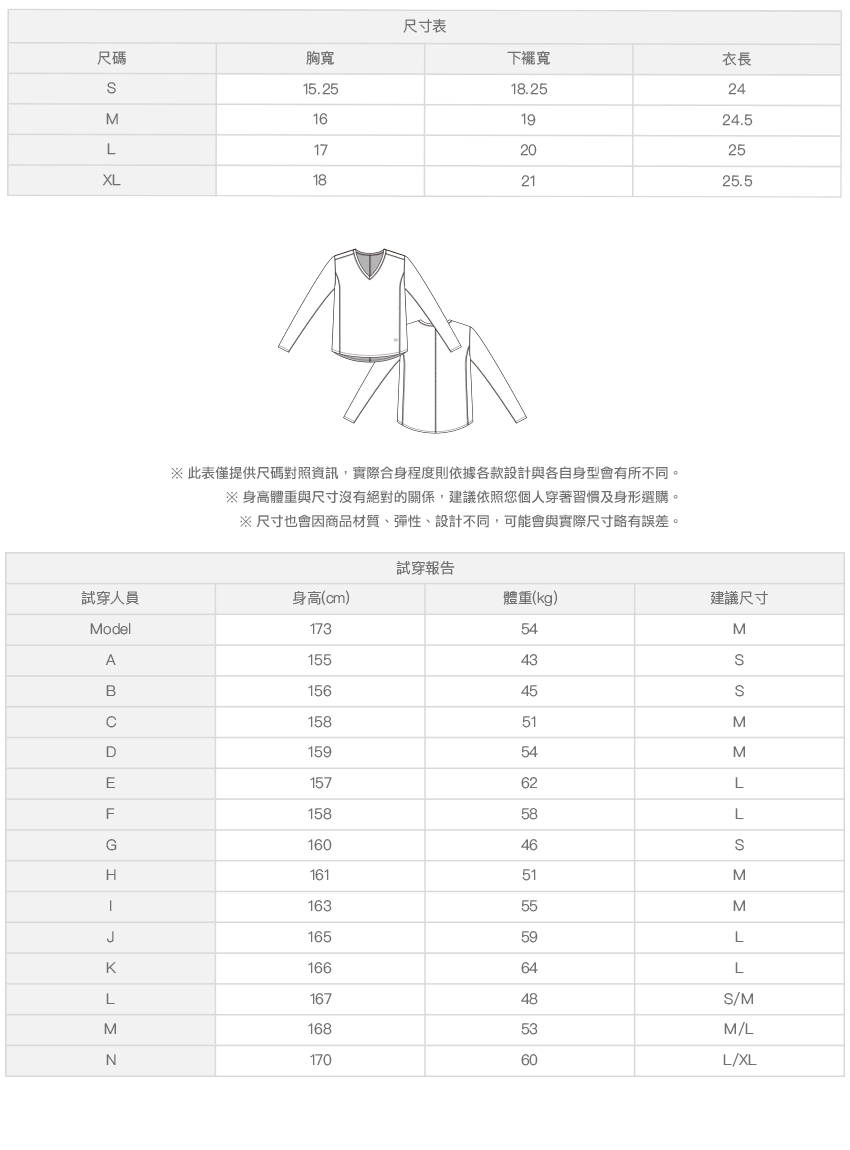 ※ 身高、體重與尺寸沒有絕對的關係,建議依照您個人穿著習慣及身形選購。