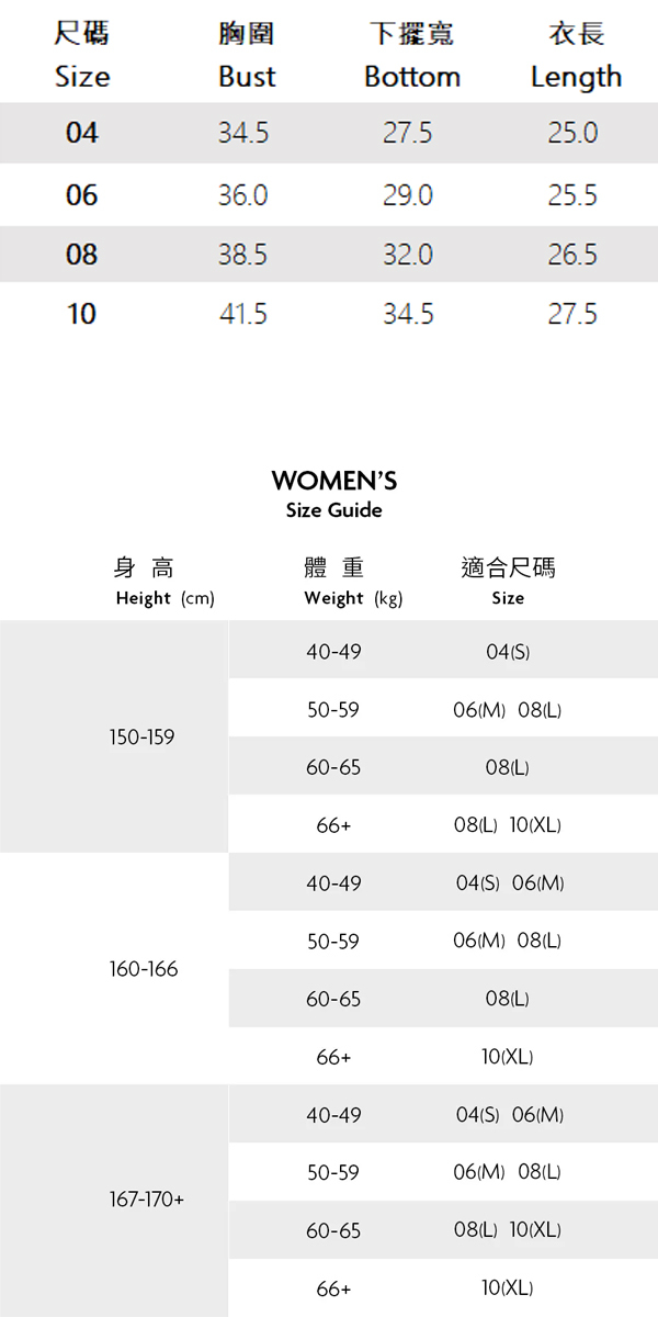 ※ 尺寸表及試穿報告僅提供尺碼對照資訊,實際合身程度則依據各款設計與各自身型會有所不同。