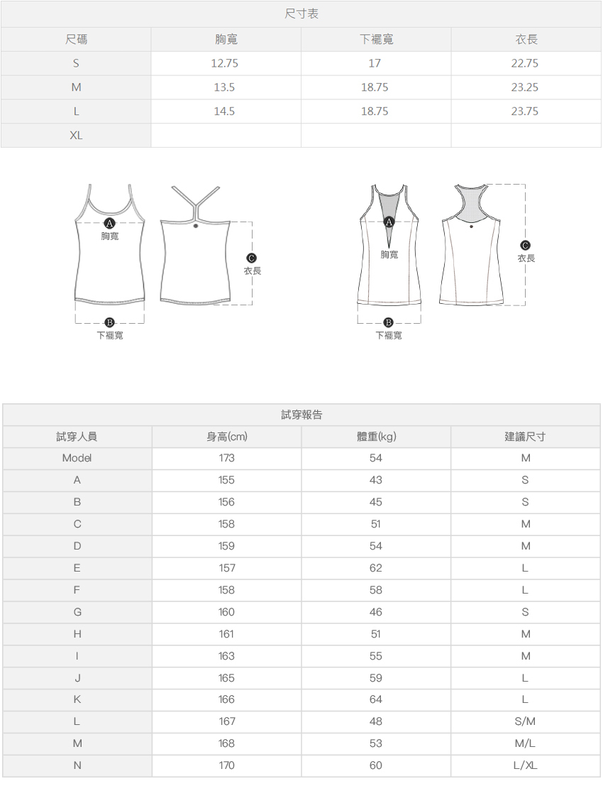 ※ 尺寸表及試穿報告僅提供尺碼對照資訊,實際合身程度則依據各款設計與各自身型會有所不同。