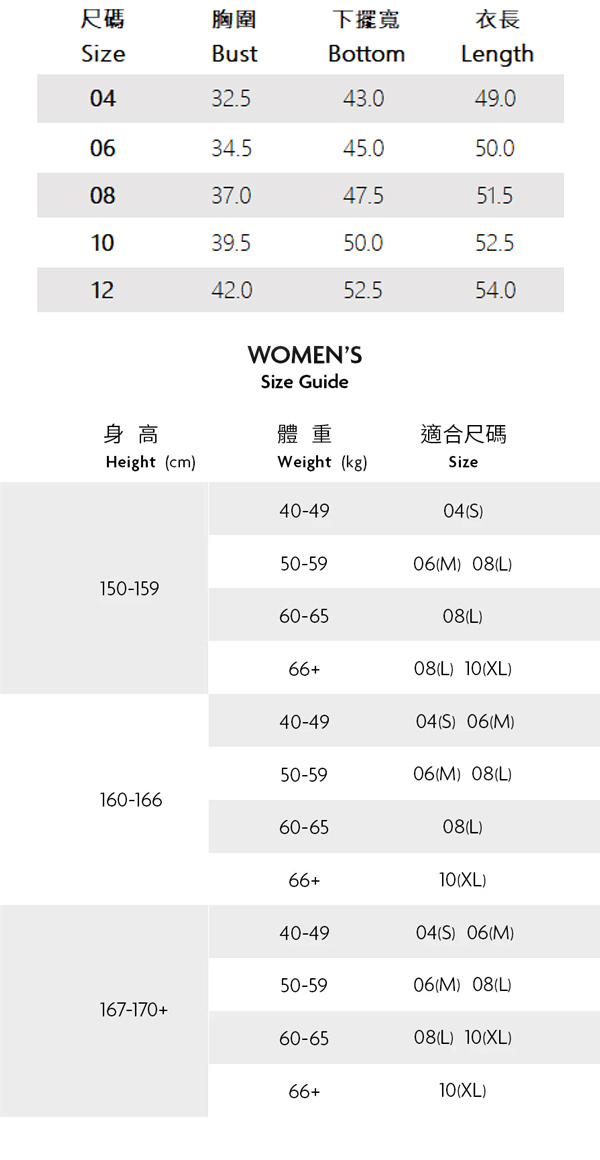 ※ 尺寸表及試穿報告僅提供尺碼對照資訊,實際合身程度則依據各款設計與各自身型會有所不同。
