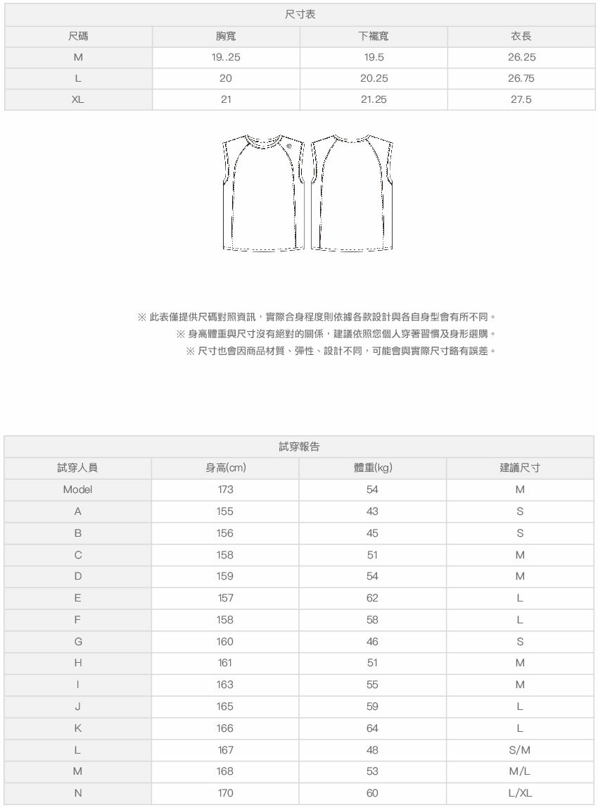 ※ 尺寸表及試穿報告僅提供尺碼對照資訊,實際合身程度則依據各款設計與各自身型會有所不同。