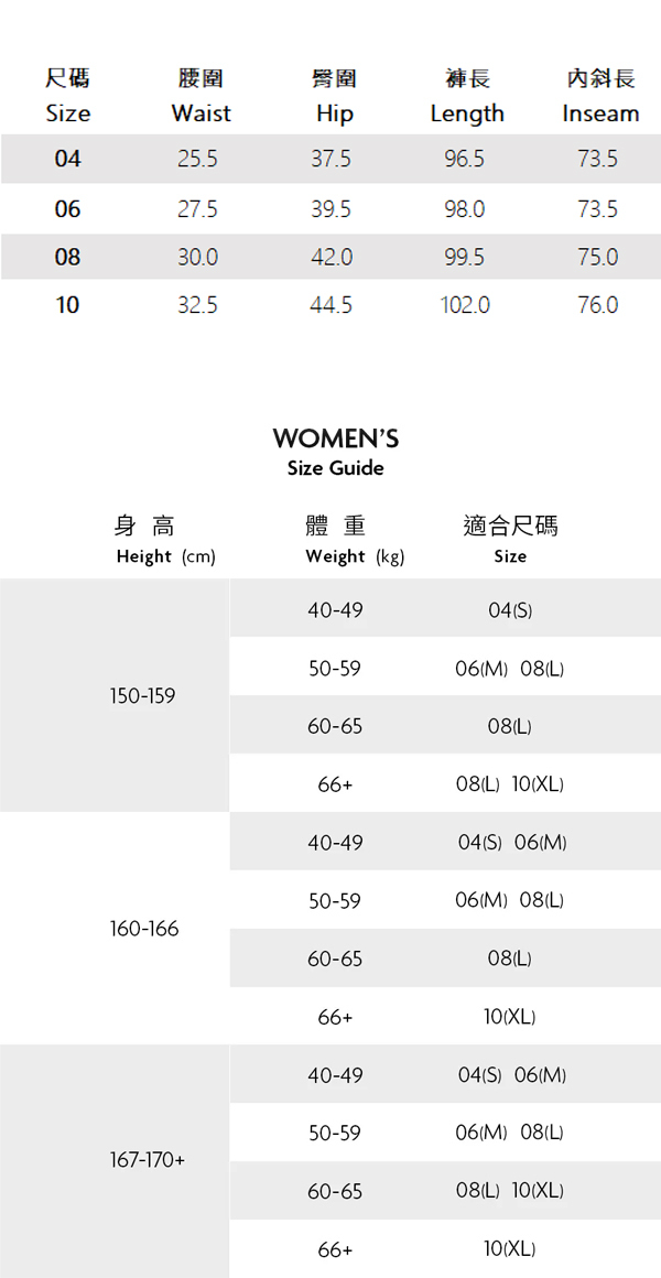 ※ 尺寸表及試穿報告僅提供尺碼對照資訊,實際合身程度則依據各款設計與各自身型會有所不同。