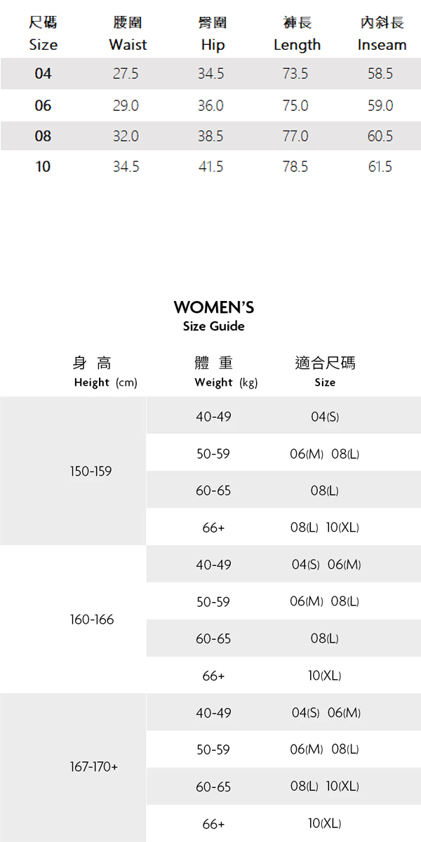 ※ 尺寸表及試穿報告僅提供尺碼對照資訊,實際合身程度則依據各款設計與各自身型會有所不同。