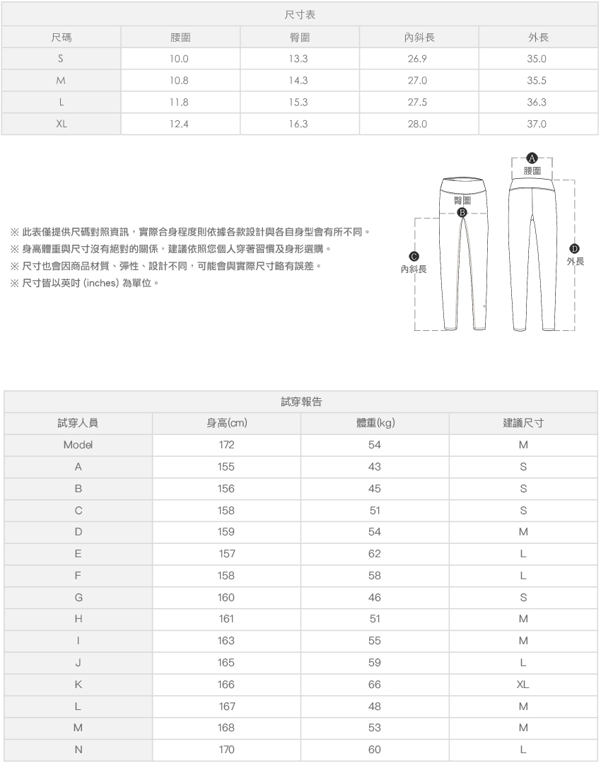 ※ 尺寸表及試穿報告僅提供尺碼對照資訊,實際合身程度則依據各款設計與各自身型會有所不同。