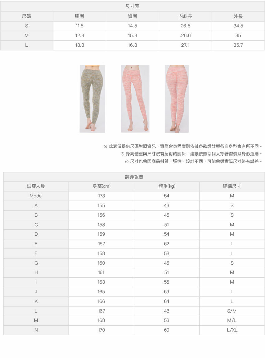 ※ 尺寸表及試穿報告僅提供尺碼對照資訊,實際合身程度則依據各款設計與各自身型會有所不同。