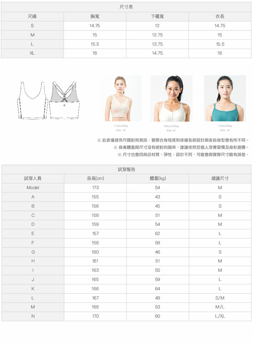 ※ 尺寸表及試穿報告僅提供尺碼對照資訊,實際合身程度則依據各款設計與各自身型會有所不同。