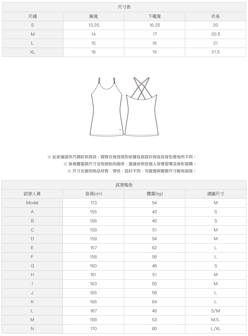 ※ 尺寸表及試穿報告僅提供尺碼對照資訊,實際合身程度則依據各款設計與各自身型會有所不同。