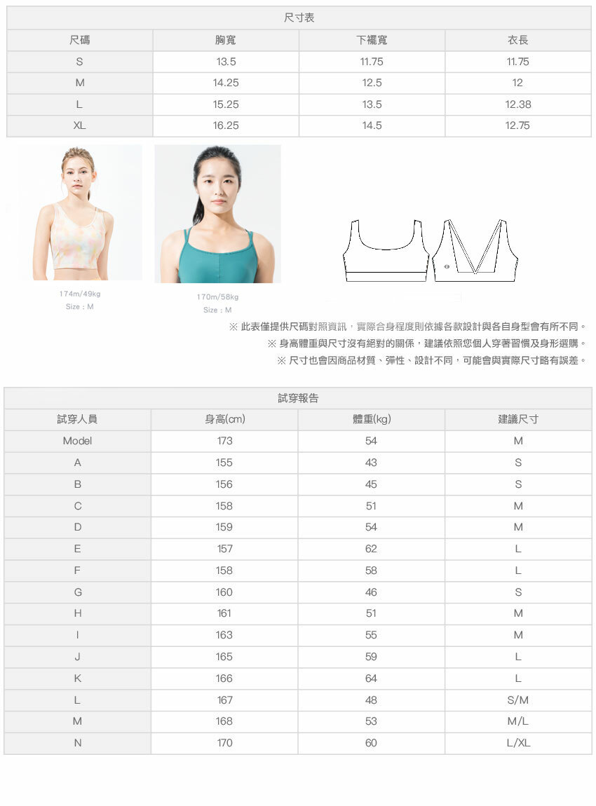 ※ 尺寸表及試穿報告僅提供尺碼對照資訊,實際合身程度則依據各款設計與各自身型會有所不同。