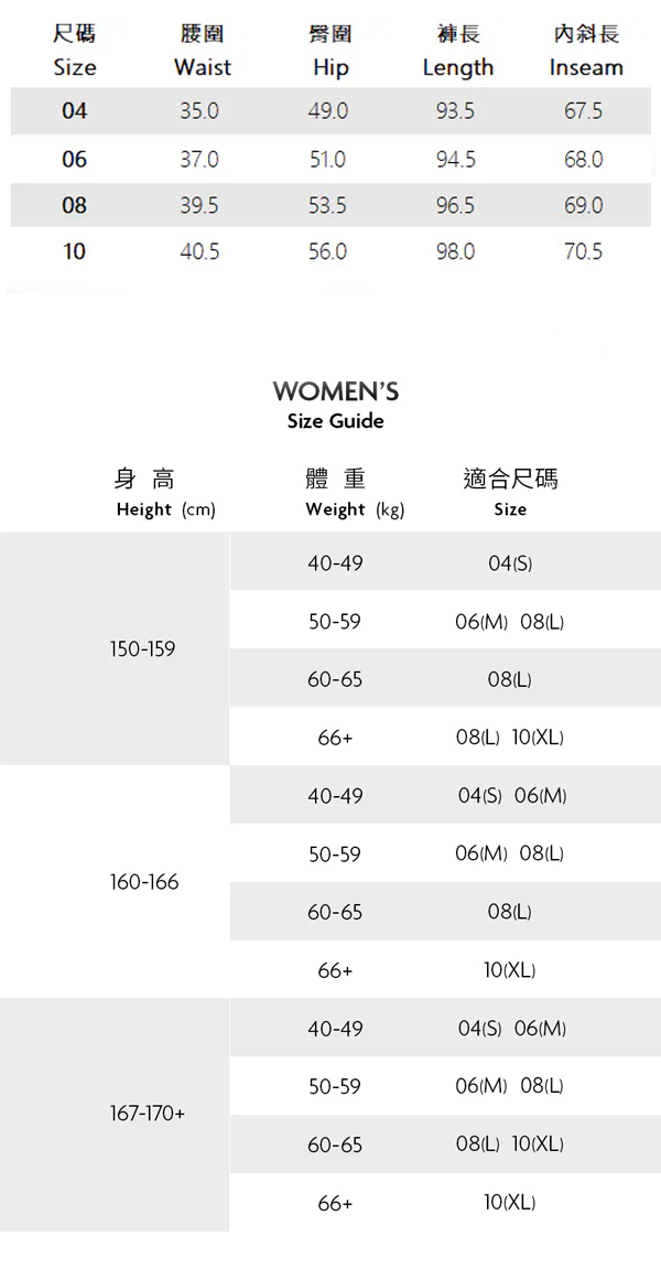 ※ 尺寸表及試穿報告僅提供尺碼對照資訊,實際合身程度則依據各款設計與各自身型會有所不同。