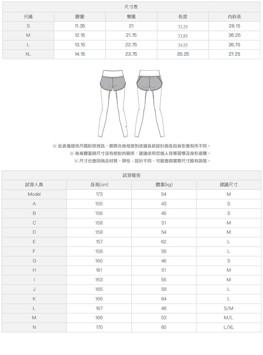 ※ 尺寸表及試穿報告僅提供尺碼對照資訊,實際合身程度則依據各款設計與各自身型會有所不同。