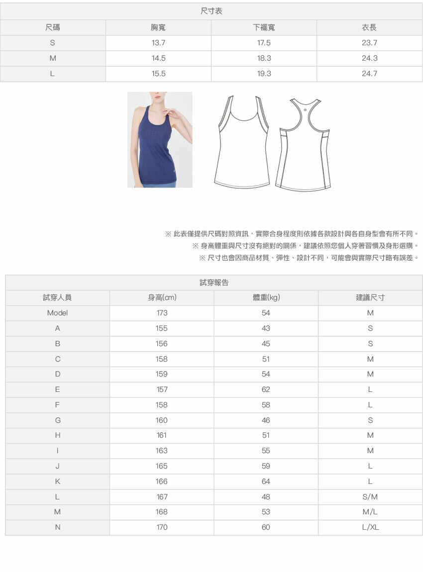 ※ 尺寸表及試穿報告僅提供尺碼對照資訊,實際合身程度則依據各款設計與各自身型會有所不同。