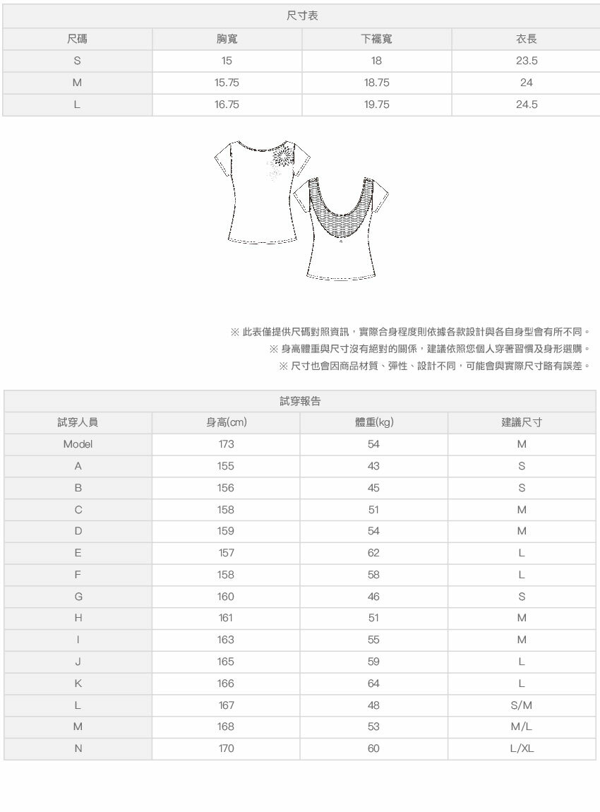 ※ 尺寸表及試穿報告僅提供尺碼對照資訊,實際合身程度則依據各款設計與各自身型會有所不同。
