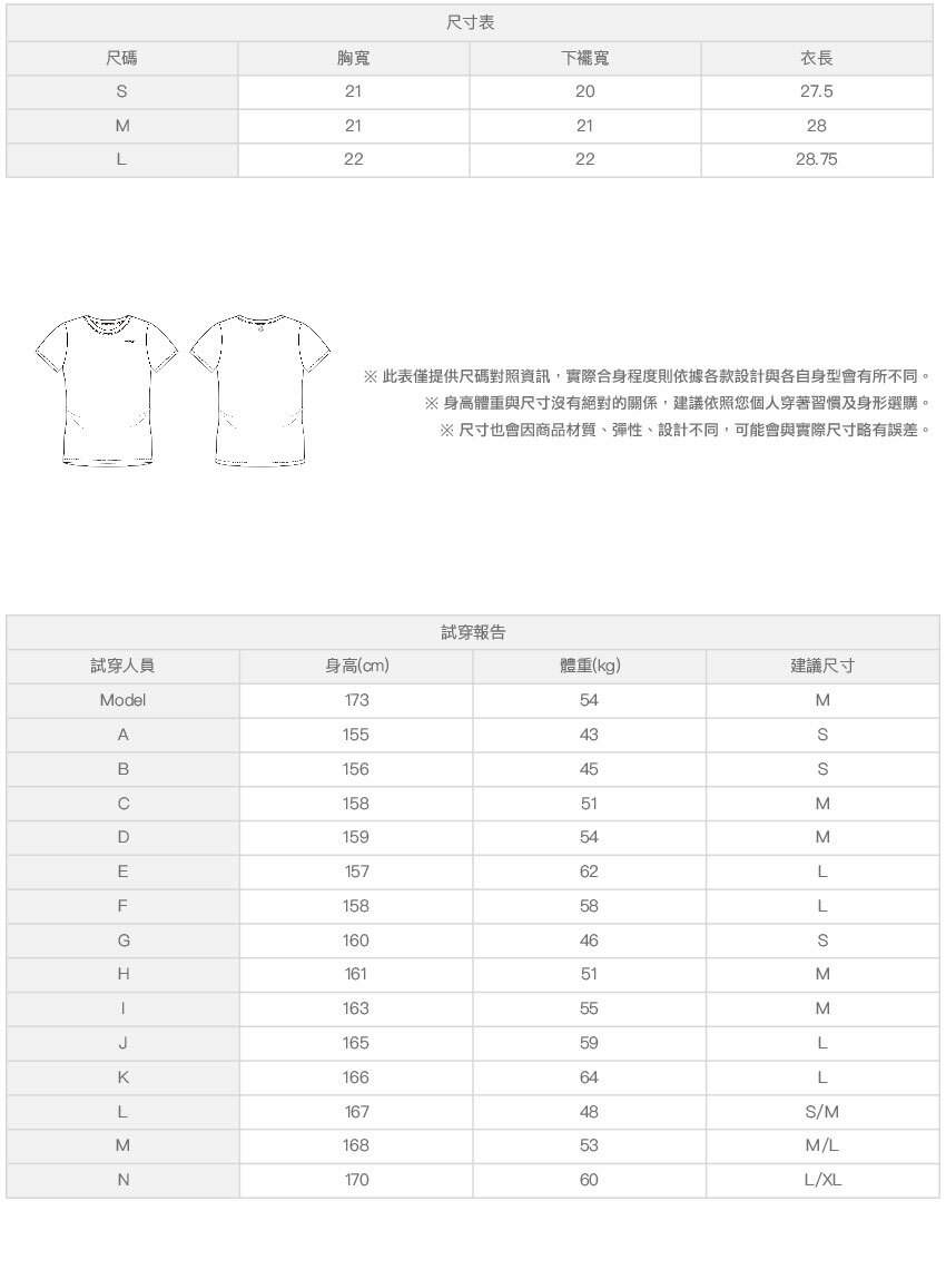 ※ 尺寸表及試穿報告僅提供尺碼對照資訊,實際合身程度則依據各款設計與各自身型會有所不同。