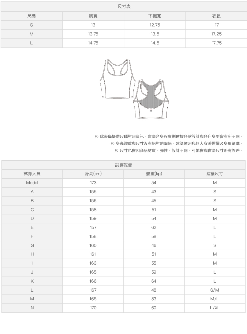 ※ 尺寸表及試穿報告僅提供尺碼對照資訊,實際合身程度則依據各款設計與各自身型會有所不同。