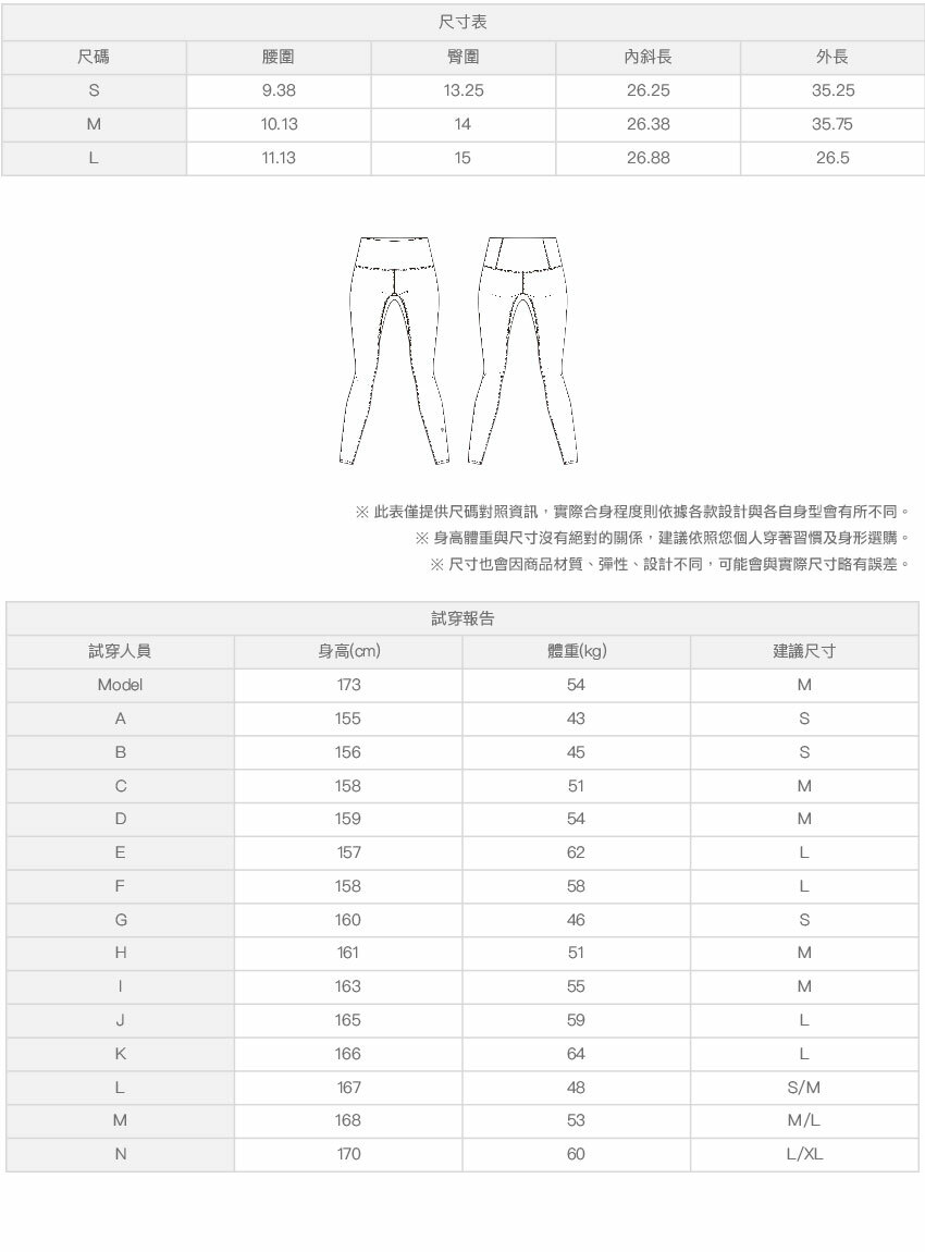 ※ 尺寸表及試穿報告僅提供尺碼對照資訊,實際合身程度則依據各款設計與各自身型會有所不同。