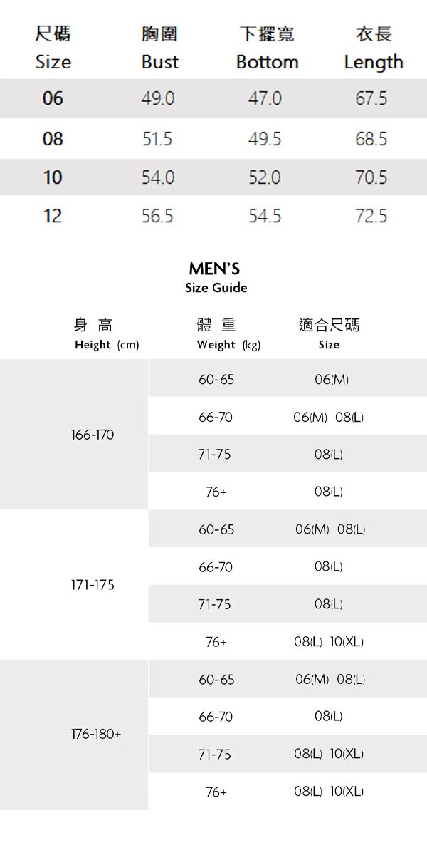 ※ 身高、體重與尺寸沒有絕對的關係,建議依照您個人穿著習慣及身形選購。