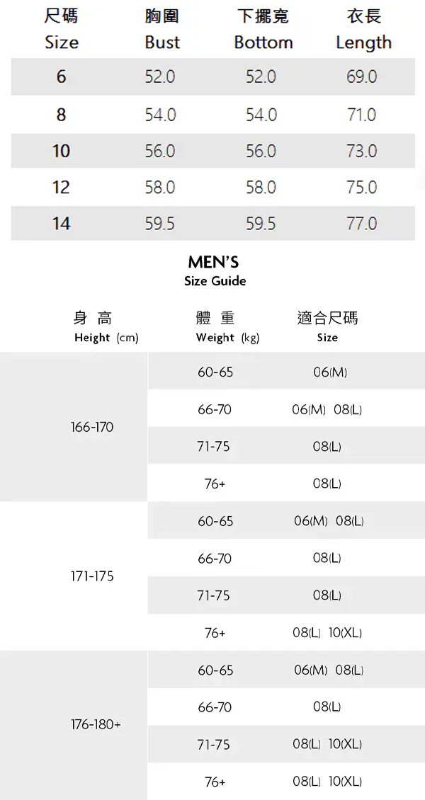 ※ 尺寸表及試穿報告僅提供尺碼對照資訊,實際合身程度則依據各款設計與各自身型會有所不同。