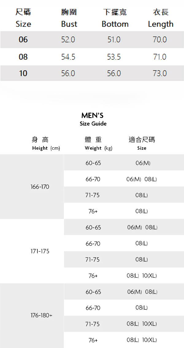 ※ 身高、體重與尺寸沒有絕對的關係,建議依照您個人穿著習慣及身形選購。