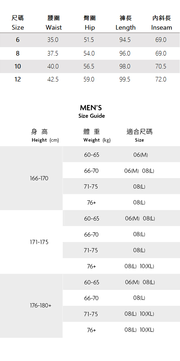 ※ 尺寸表及試穿報告僅提供尺碼對照資訊,實際合身程度則依據各款設計與各自身型會有所不同。
