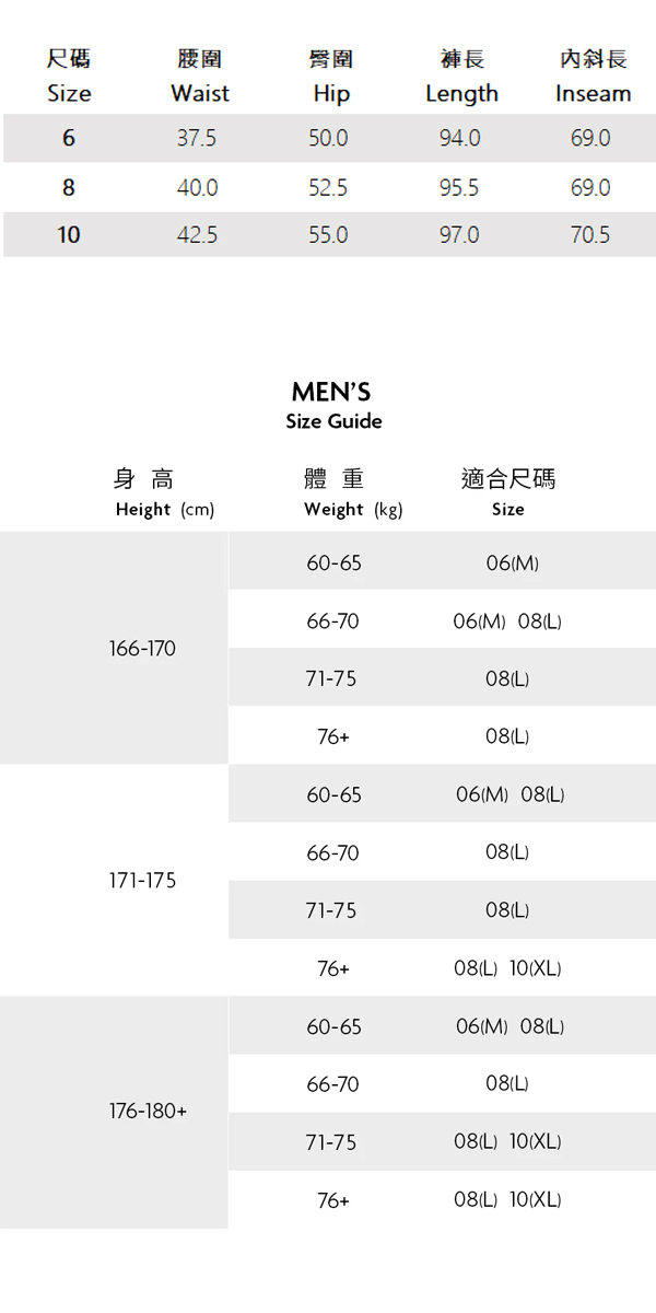 ※ 身高、體重與尺寸沒有絕對的關係,建議依照您個人穿著習慣及身形選購。