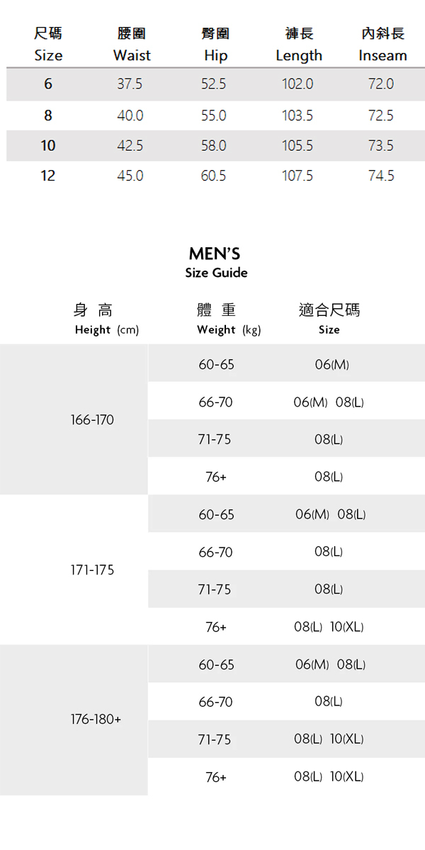 ※ 尺寸表及試穿報告僅提供尺碼對照資訊,實際合身程度則依據各款設計與各自身型會有所不同。