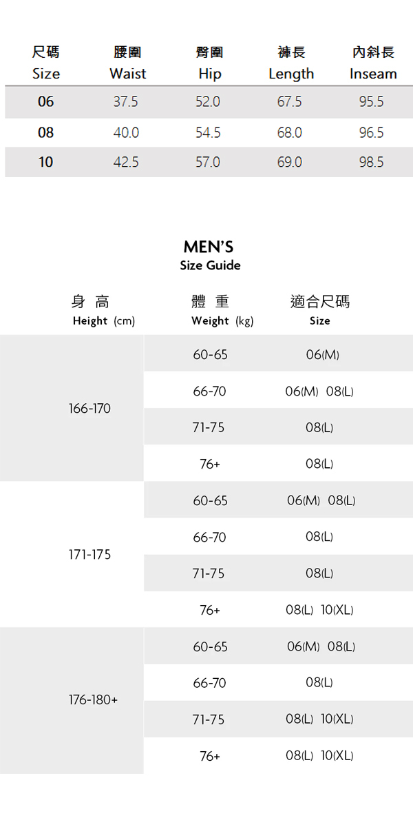 ※ 身高、體重與尺寸沒有絕對的關係,建議依照您個人穿著習慣及身形選購。
