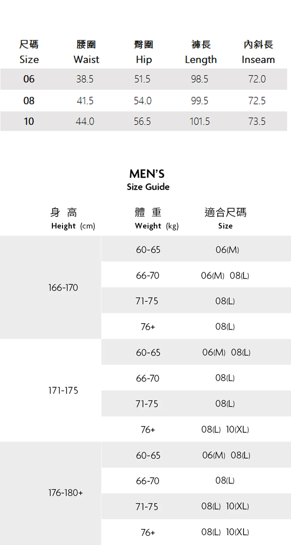 ※ 身高、體重與尺寸沒有絕對的關係,建議依照您個人穿著習慣及身形選購。