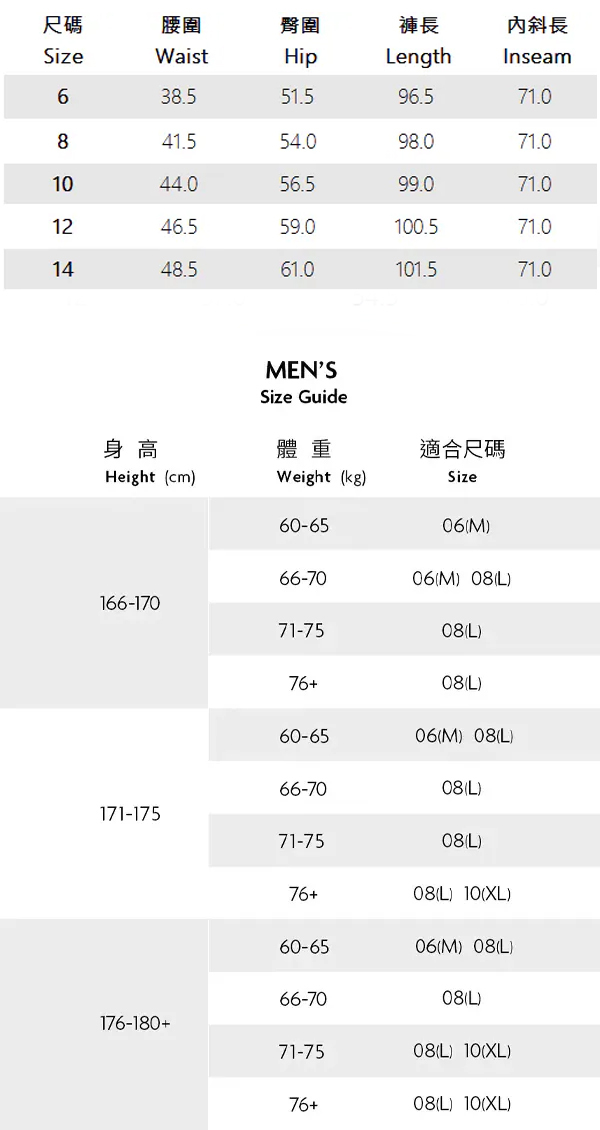 ※ 身高、體重與尺寸沒有絕對的關係,建議依照您個人穿著習慣及身形選購。