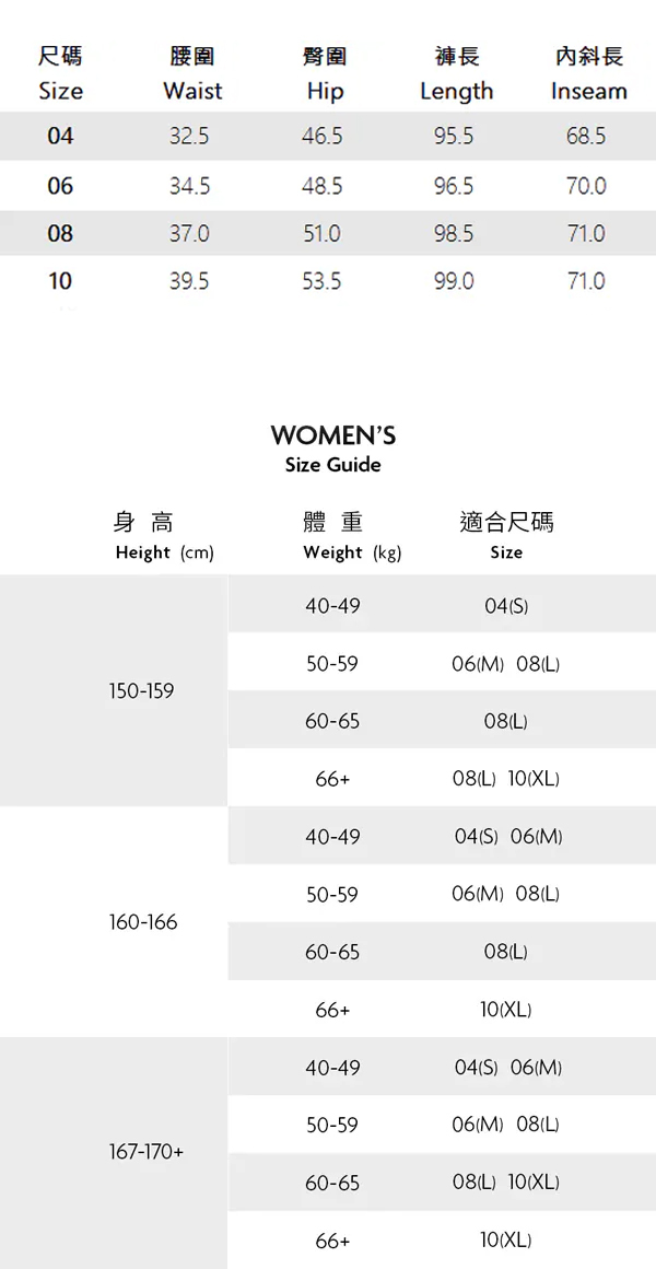 ※ 尺寸表及試穿報告僅提供尺碼對照資訊,實際合身程度則依據各款設計與各自身型會有所不同。