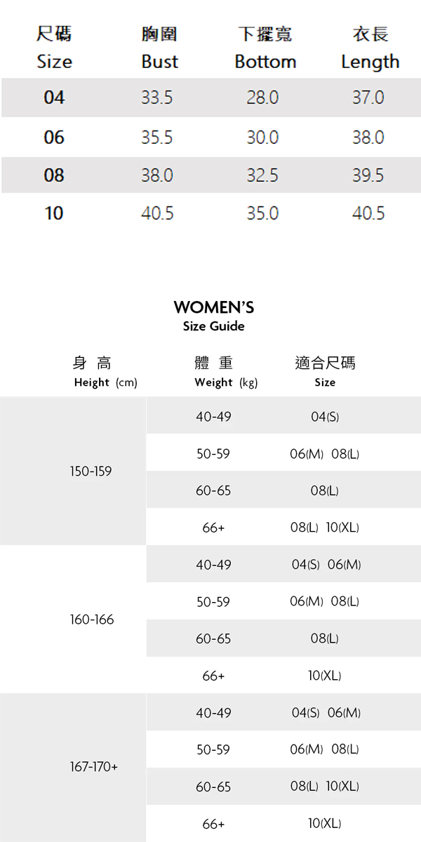 ※ 尺寸表及試穿報告僅提供尺碼對照資訊,實際合身程度則依據各款設計與各自身型會有所不同。