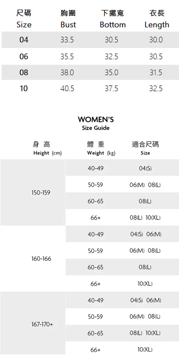 ※ 尺寸表及試穿報告僅提供尺碼對照資訊,實際合身程度則依據各款設計與各自身型會有所不同。