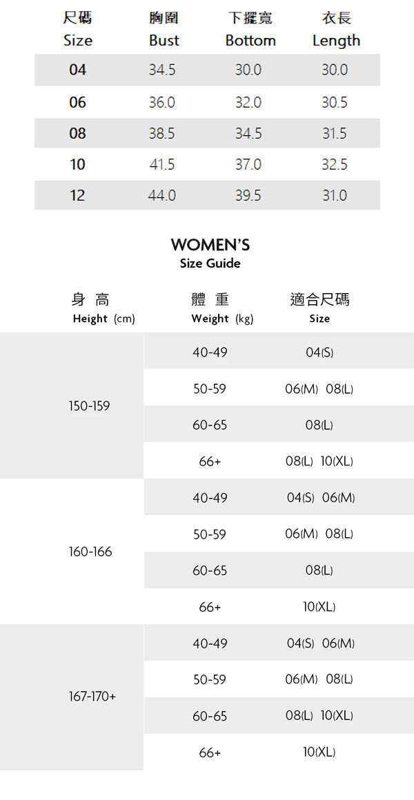 ※ 尺寸表及試穿報告僅提供尺碼對照資訊,實際合身程度則依據各款設計與各自身型會有所不同。