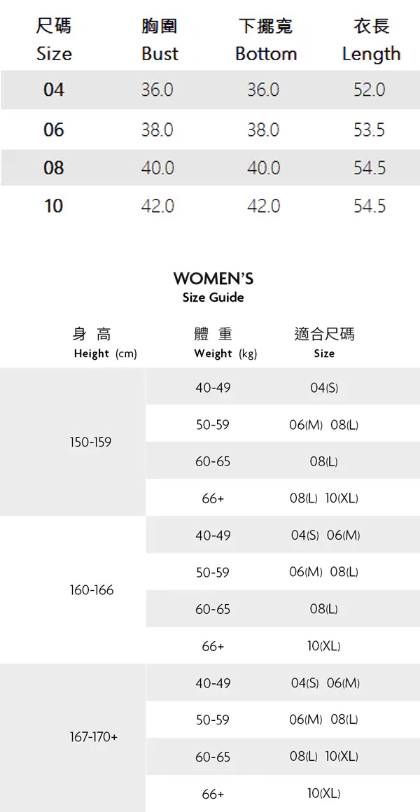 ※ 尺寸表及試穿報告僅提供尺碼對照資訊,實際合身程度則依據各款設計與各自身型會有所不同。