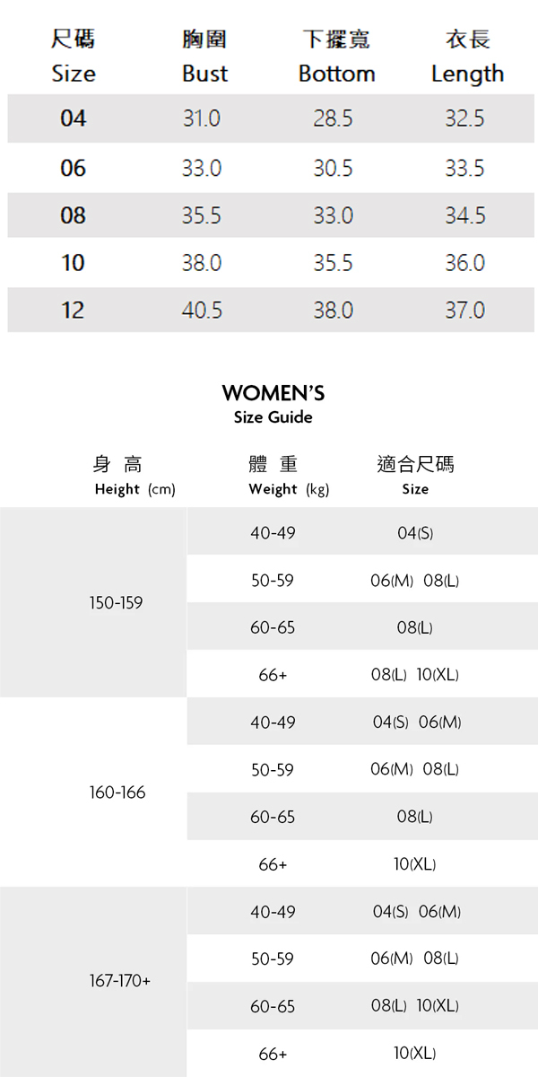 ※ 尺寸表及試穿報告僅提供尺碼對照資訊,實際合身程度則依據各款設計與各自身型會有所不同。