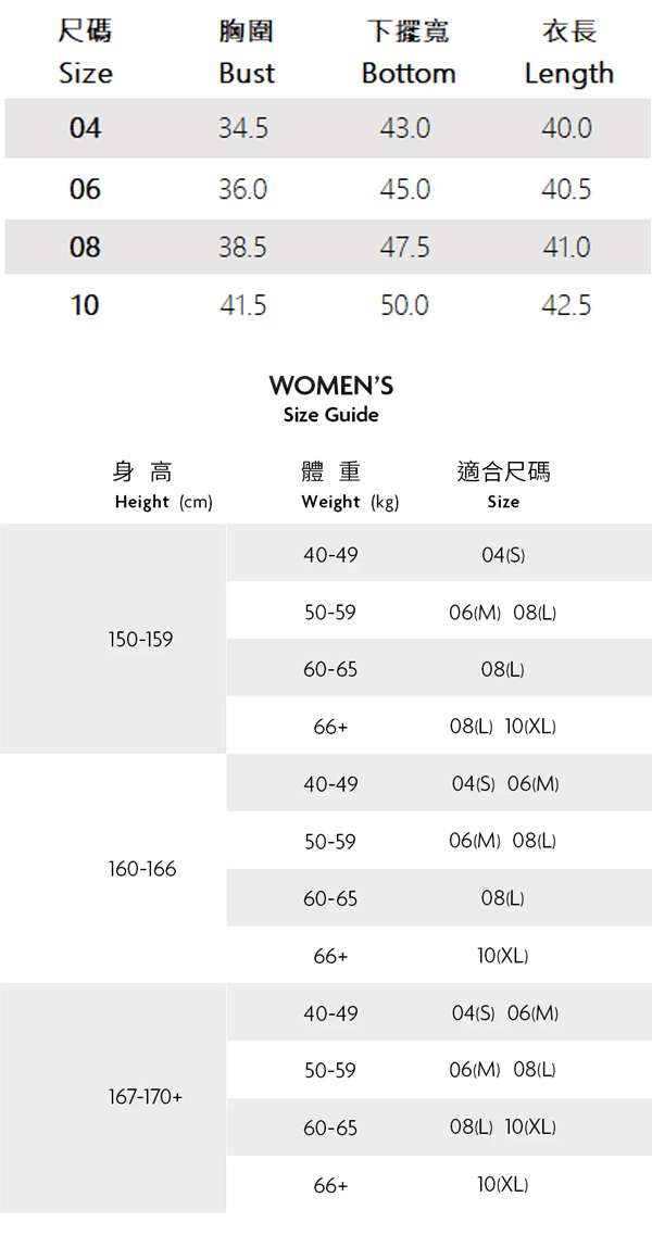 ※ 尺寸表及試穿報告僅提供尺碼對照資訊,實際合身程度則依據各款設計與各自身型會有所不同。
