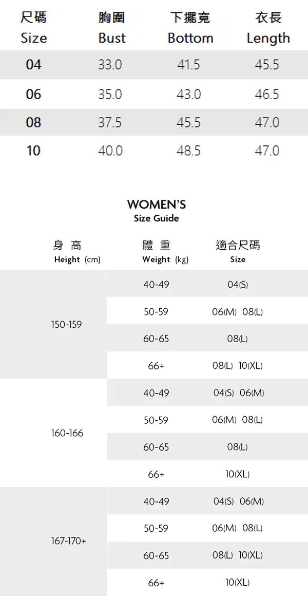 ※ 尺寸表及試穿報告僅提供尺碼對照資訊,實際合身程度則依據各款設計與各自身型會有所不同。