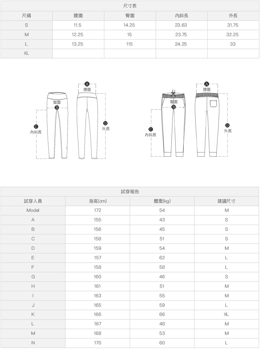 ※ 尺寸表及試穿報告僅提供尺碼對照資訊,實際合身程度則依據各款設計與各自身型會有所不同。