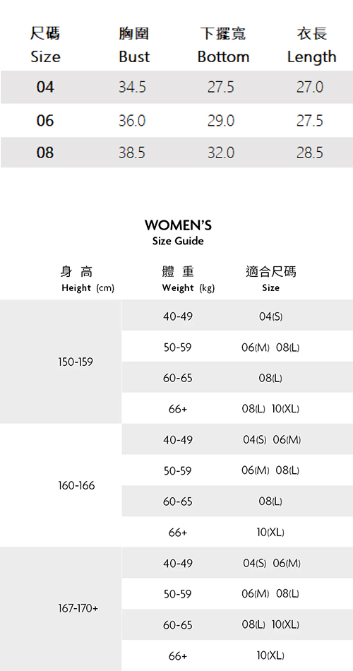 ※ 尺寸表及試穿報告僅提供尺碼對照資訊,實際合身程度則依據各款設計與各自身型會有所不同。