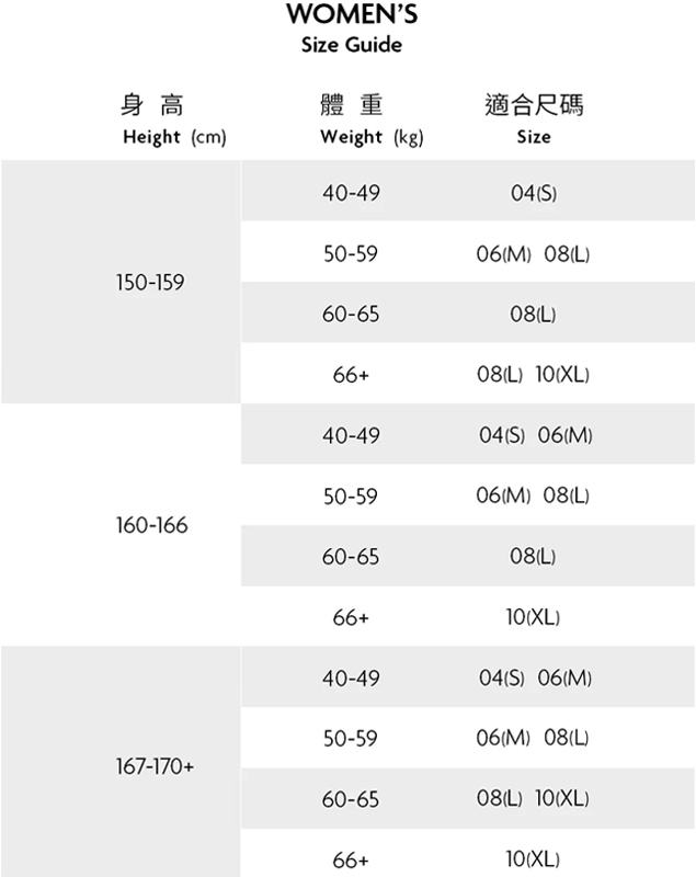 ※ 身高、體重與尺寸沒有絕對的關係,建議依照您個人穿著習慣及身形選購。