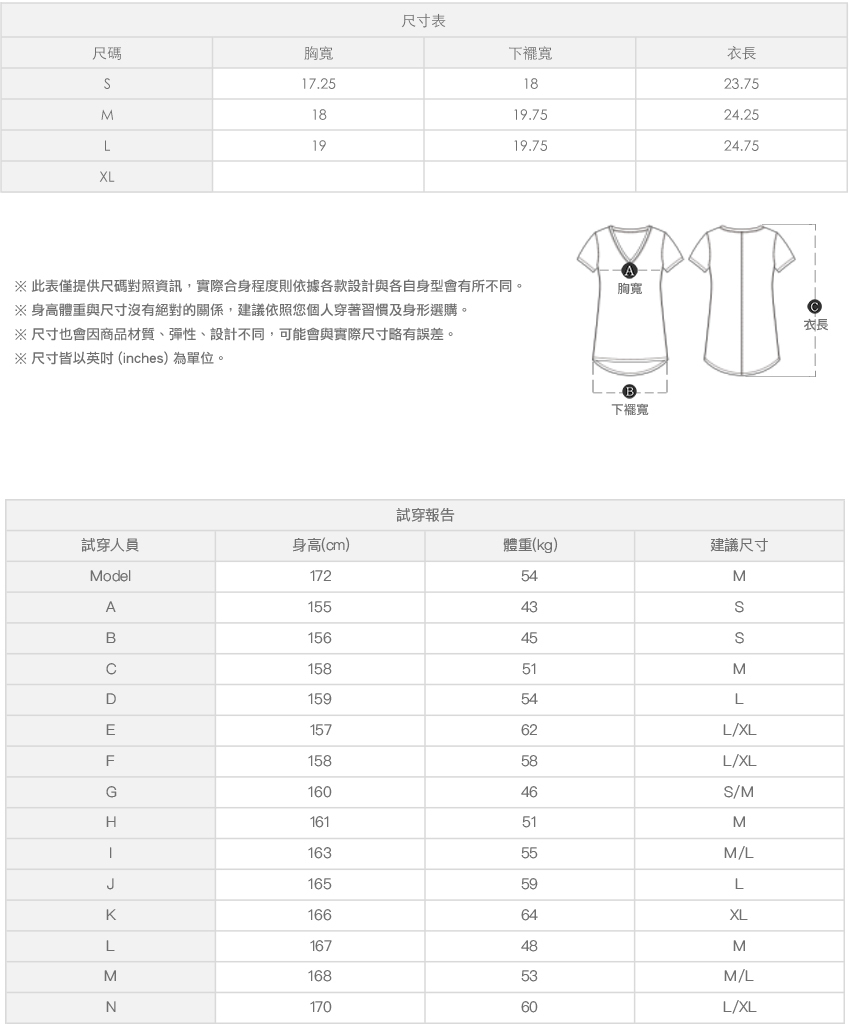 ※ 尺寸表及試穿報告僅提供尺碼對照資訊,實際合身程度則依據各款設計與各自身型會有所不同。