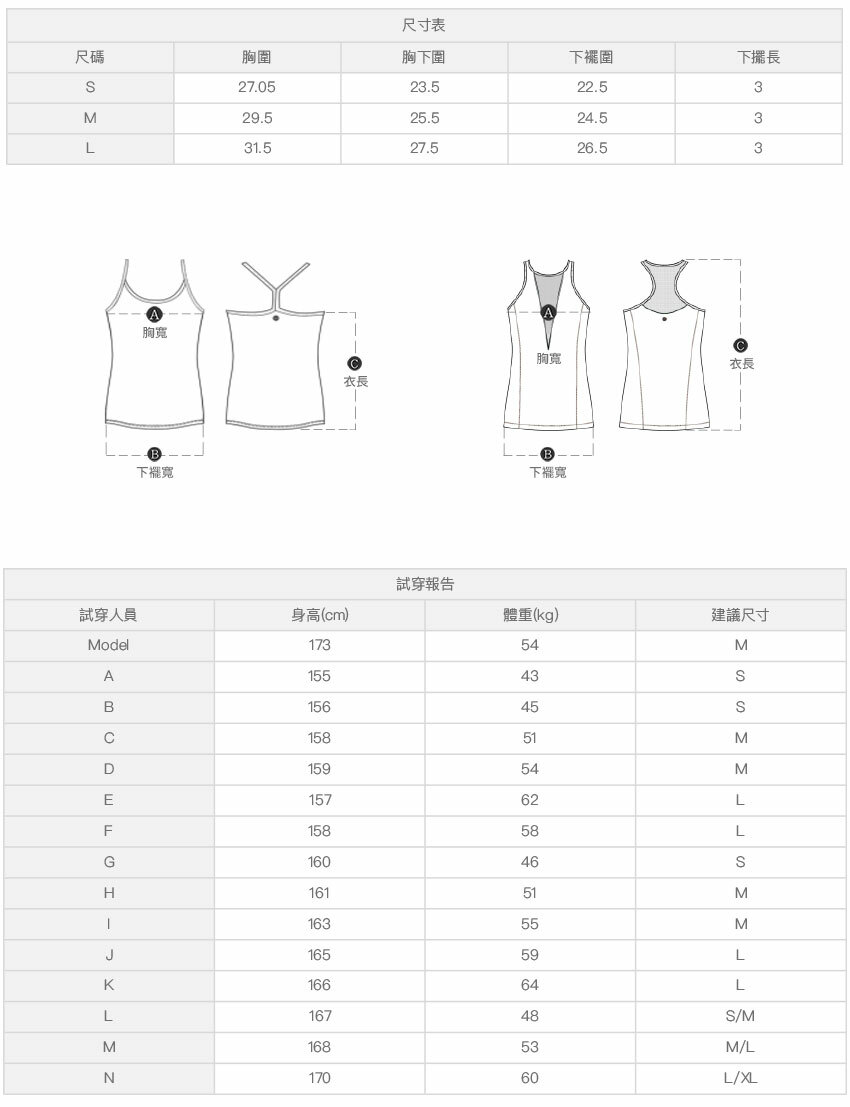 ※ 尺寸表及試穿報告僅提供尺碼對照資訊,實際合身程度則依據各款設計與各自身型會有所不同。