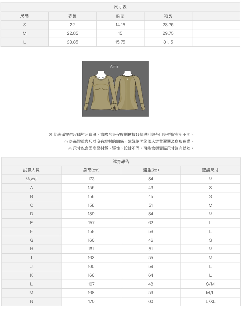 ※ 尺寸表及試穿報告僅提供尺碼對照資訊,實際合身程度則依據各款設計與各自身型會有所不同。