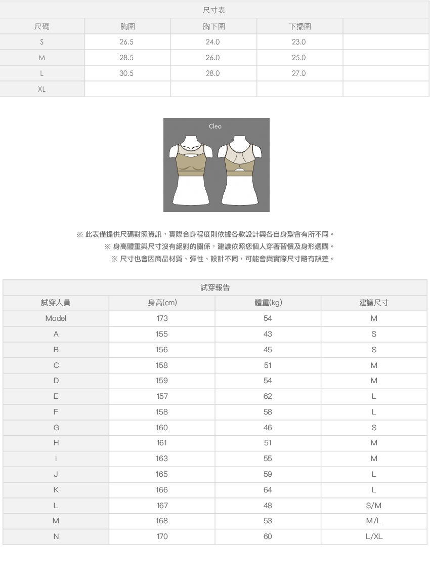 ※ 尺寸表及試穿報告僅提供尺碼對照資訊,實際合身程度則依據各款設計與各自身型會有所不同。